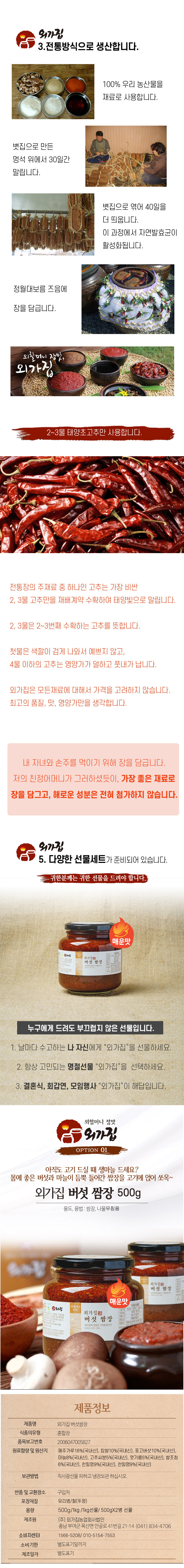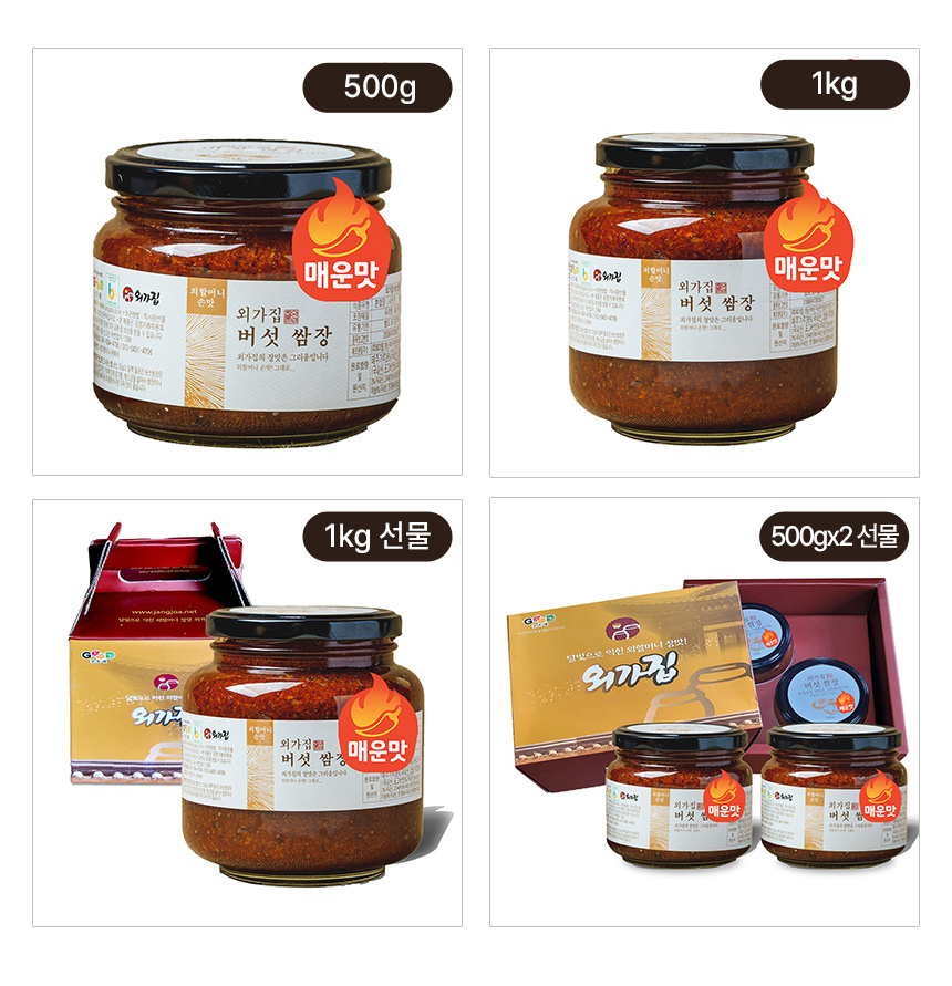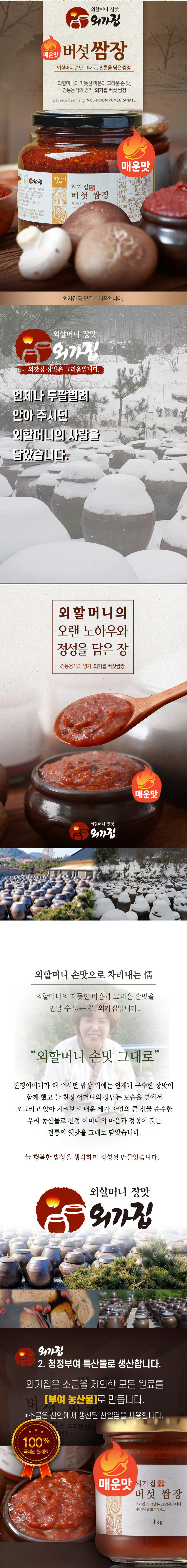 원재료명 및 함량 | 메주가루16%(국내산)찹쌀10%(국내산)표고버섯10%(국내산)고춧씨가루5%(국내산)천일염9%(국내산)엿기름5%(국내산)간마늘8%(국내산)쌀조청6%(국내산)정제수31% |